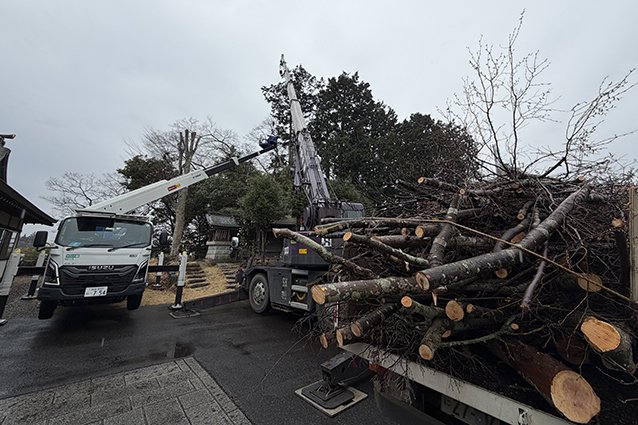 重機のオペレーターの方と、クレーンのカゴに乗って枝を払って行く方、払った枝をチェーンソーで小さくする方、まとまった枝を重機でトラックに乗せる方と、効率が良すぎてちょっと目を離した隙に、随分と作業が進んでしまいます